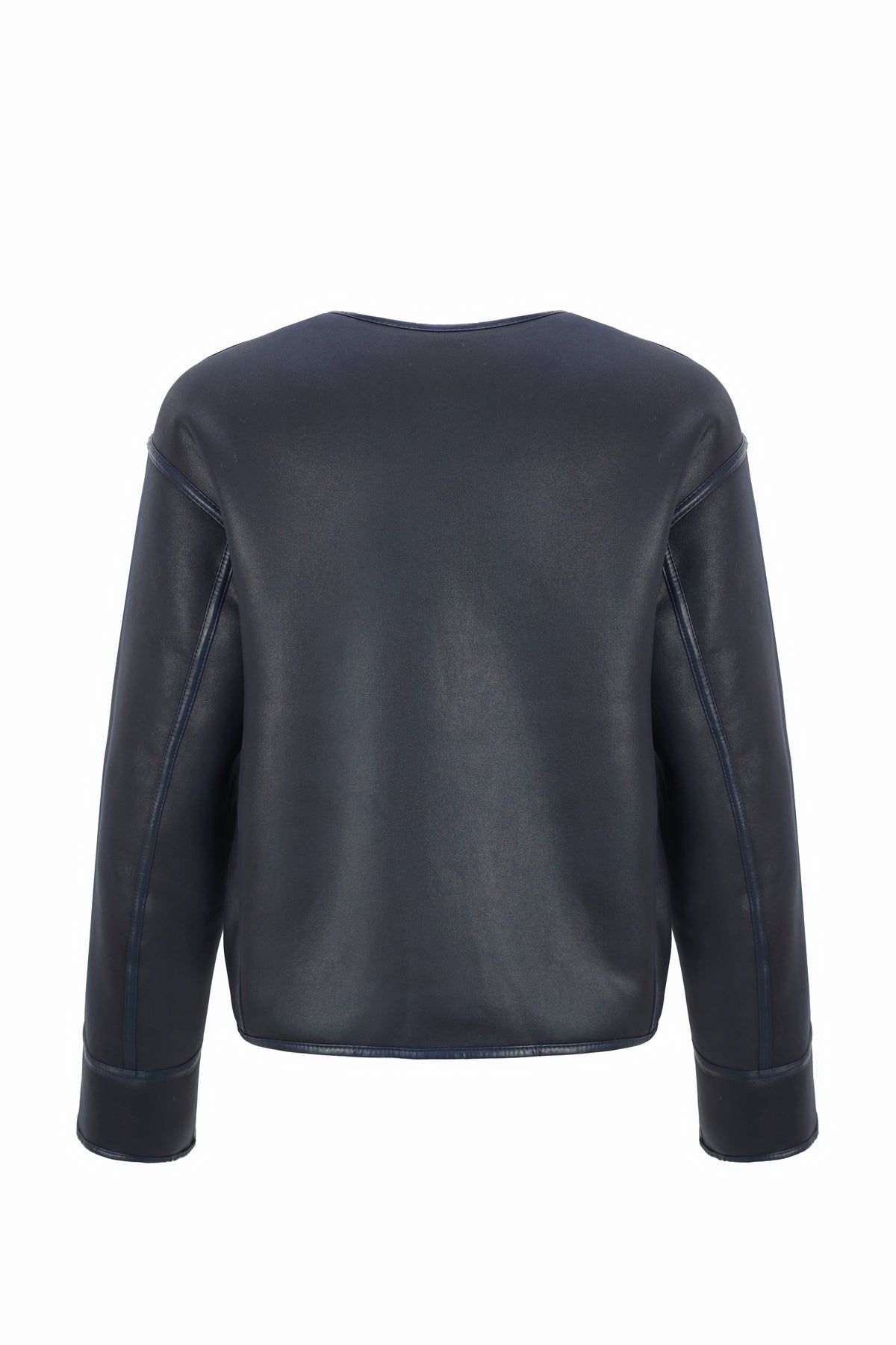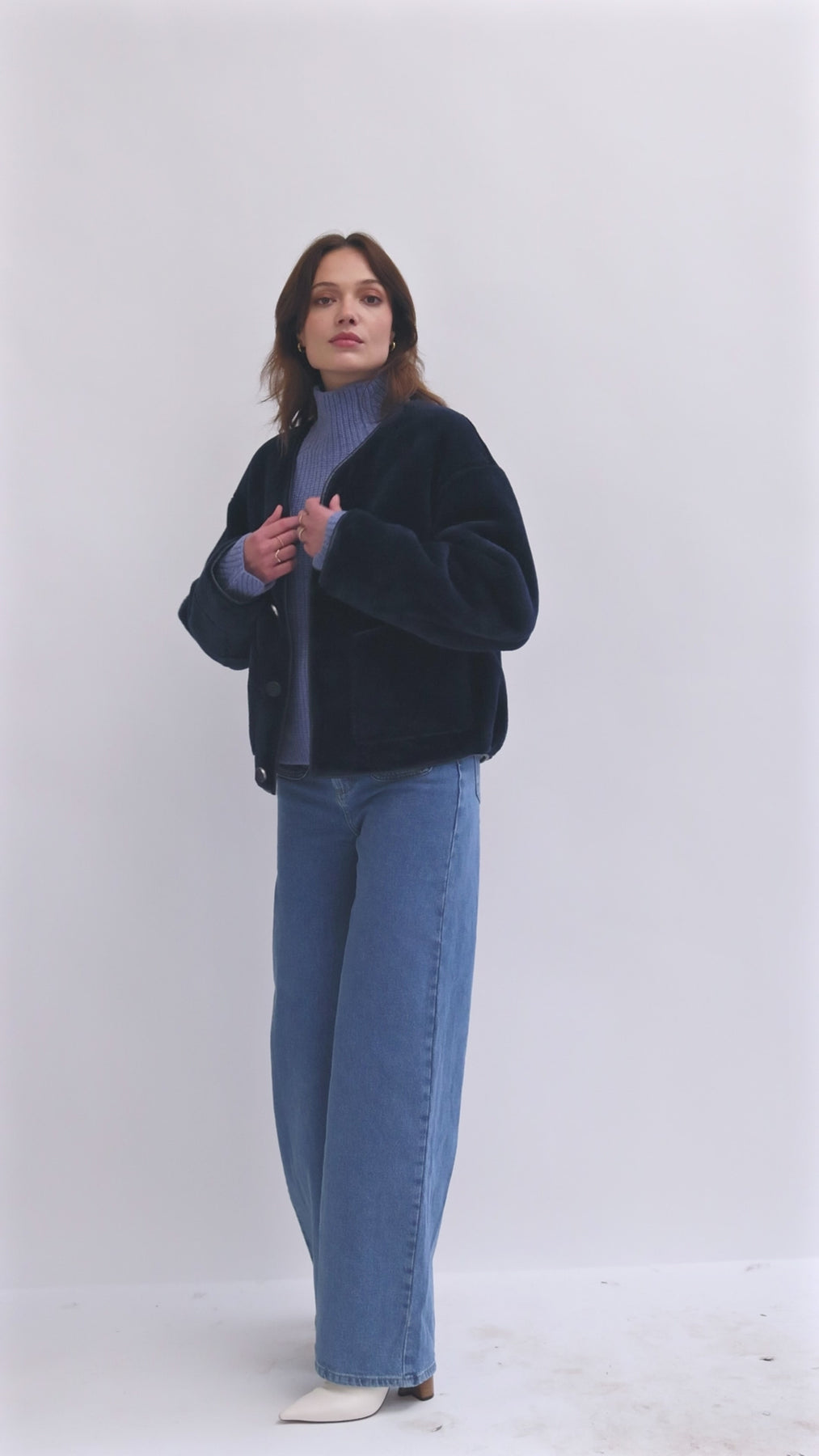 The boxy, collarless cut feels modern and easy to layer, while the button closure keeps the style clean and minimal. On the shearling side, you’ll find appliqué patch pockets that add texture and coziness; flip it over to the faux leather side, and you get sleek zip pockets for an edgier vibe.