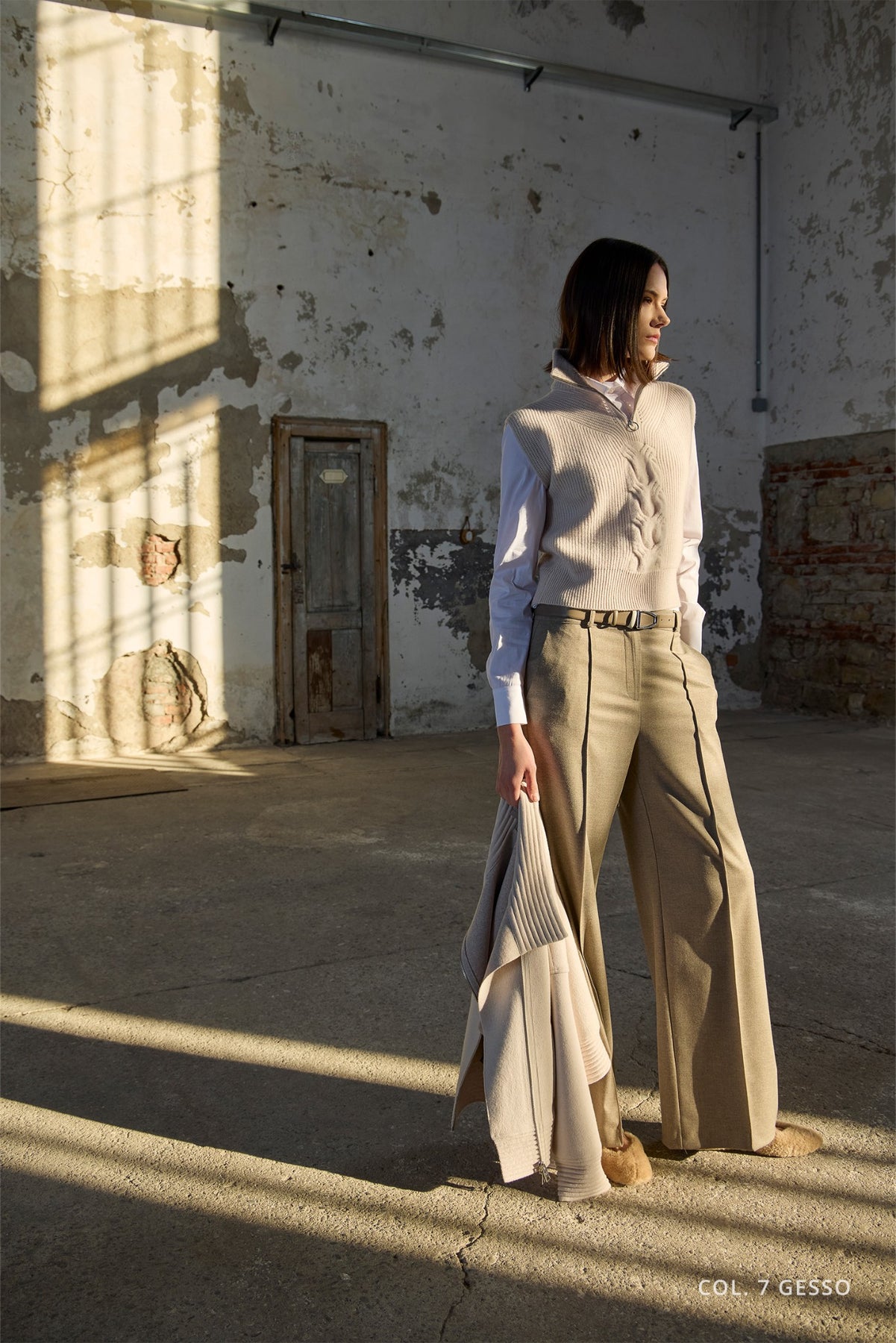 This cashmere-blend gilet features a high neck and a sleek half-zip design, enhanced by a central cable-knit detail. The zip adds a modern, dynamic touch that perfectly balances the refined softness of the yarn. A versatile and elegant piece, ideal for elevating everyday looks with effortless style, comfort, and warmth.