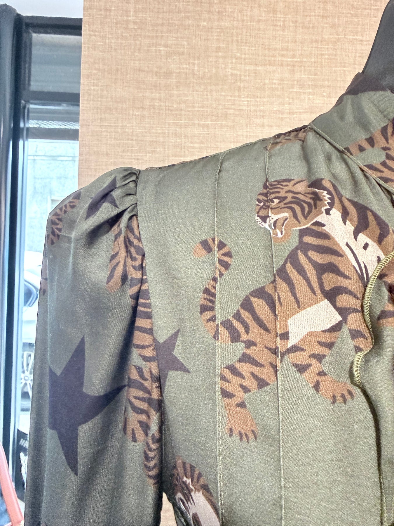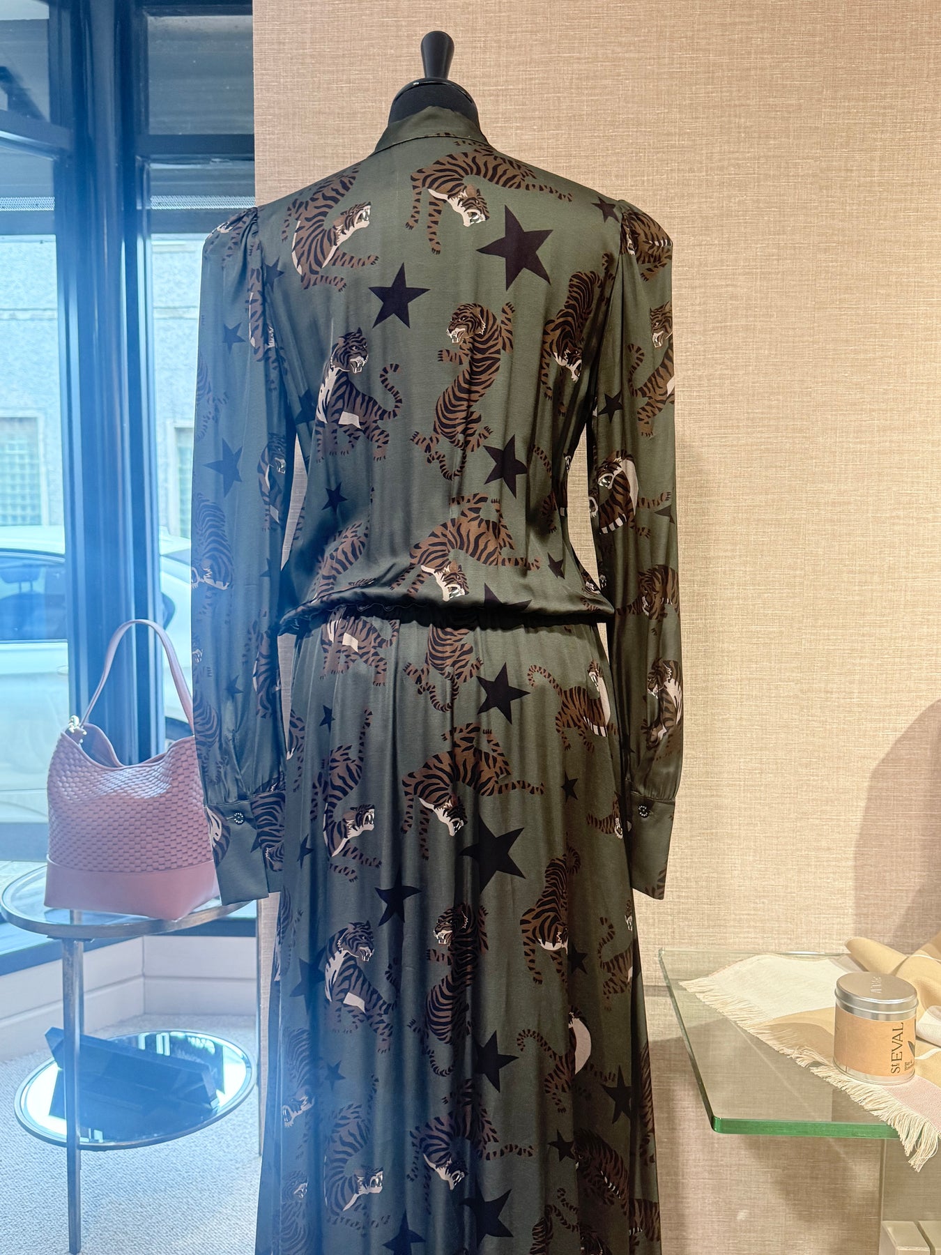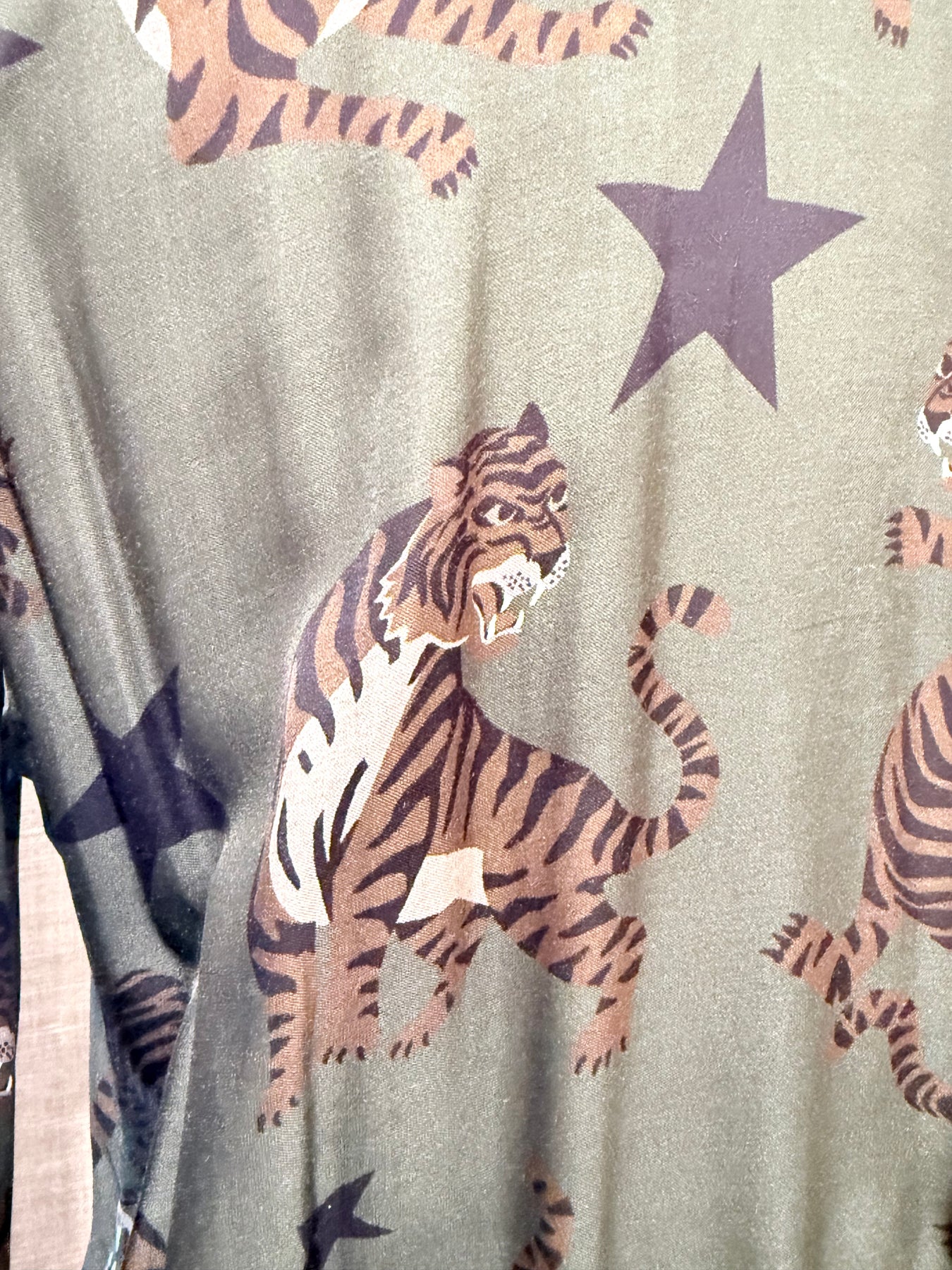 - Full-length flared skirt with a striking tiger and star print