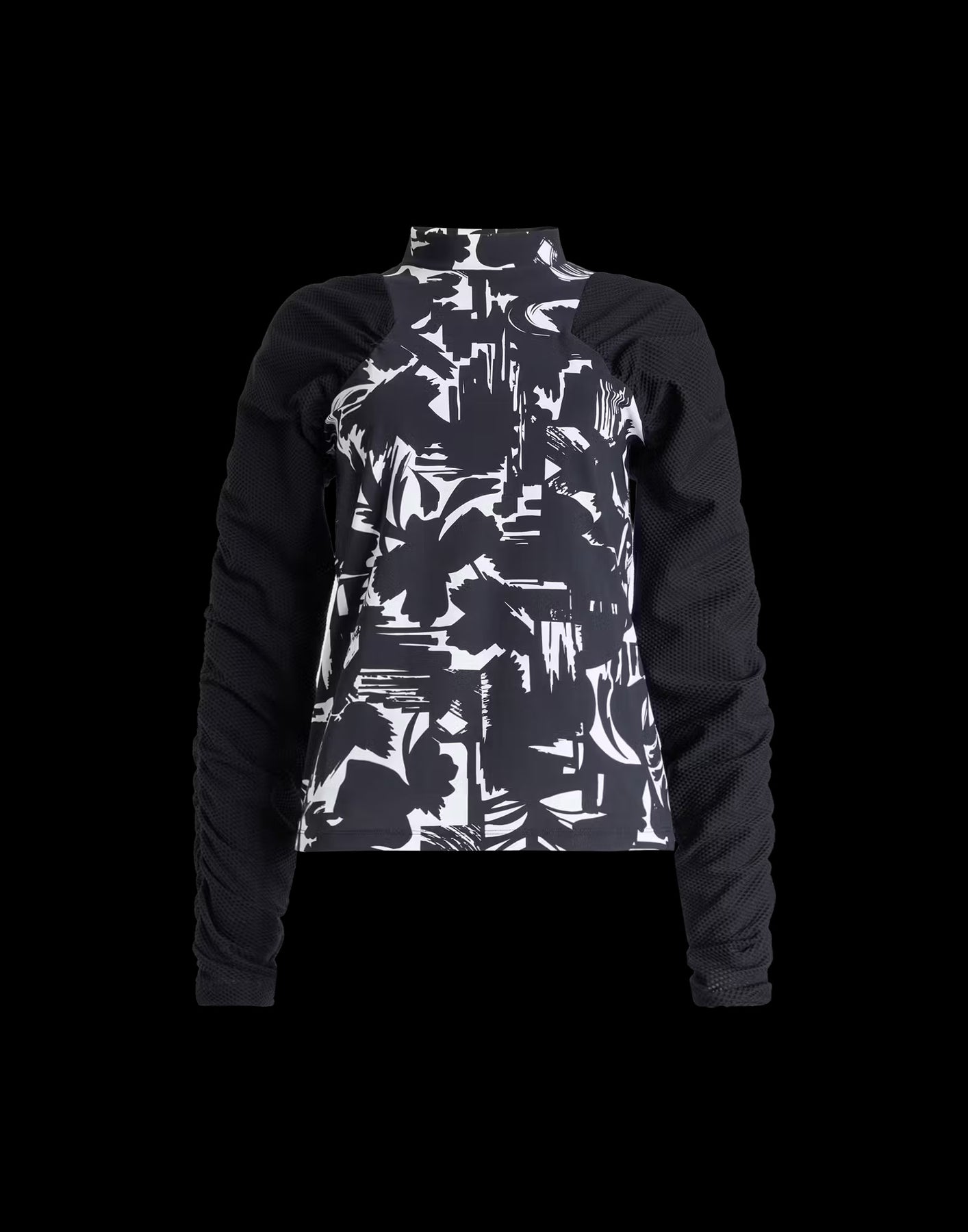 This original design with a mock neck combines a printed Sensitive® bodice with black mesh long sleeves featuring delicate gathers for a feminine touch.