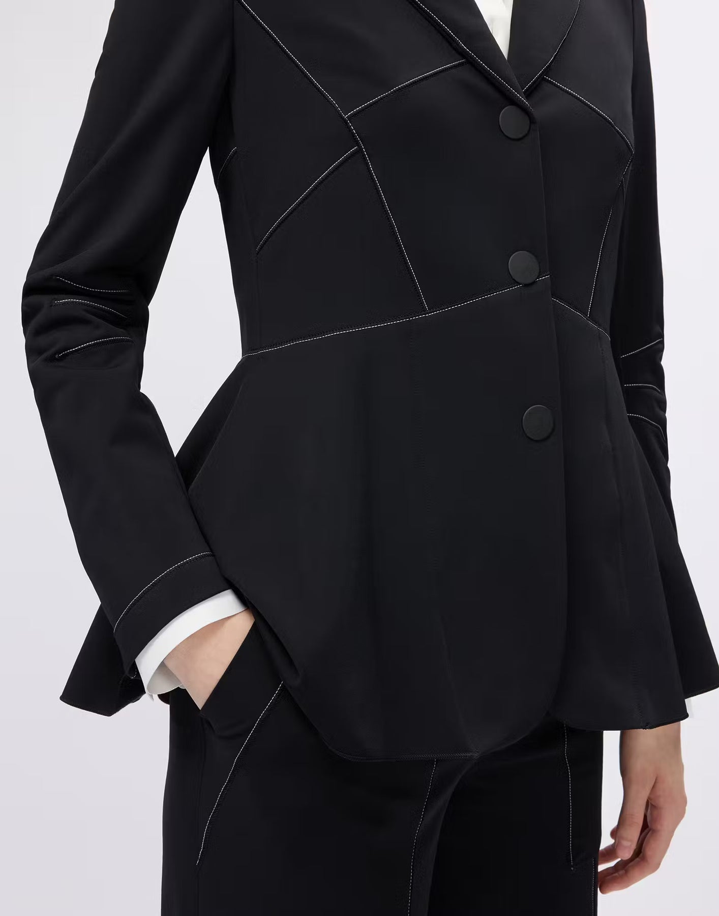 Defined by a small notched collar, it features white contrast topstitching that enhances the bust and sleeve seams, flattering the figure, while the slightly flared line creates an elegant movement.